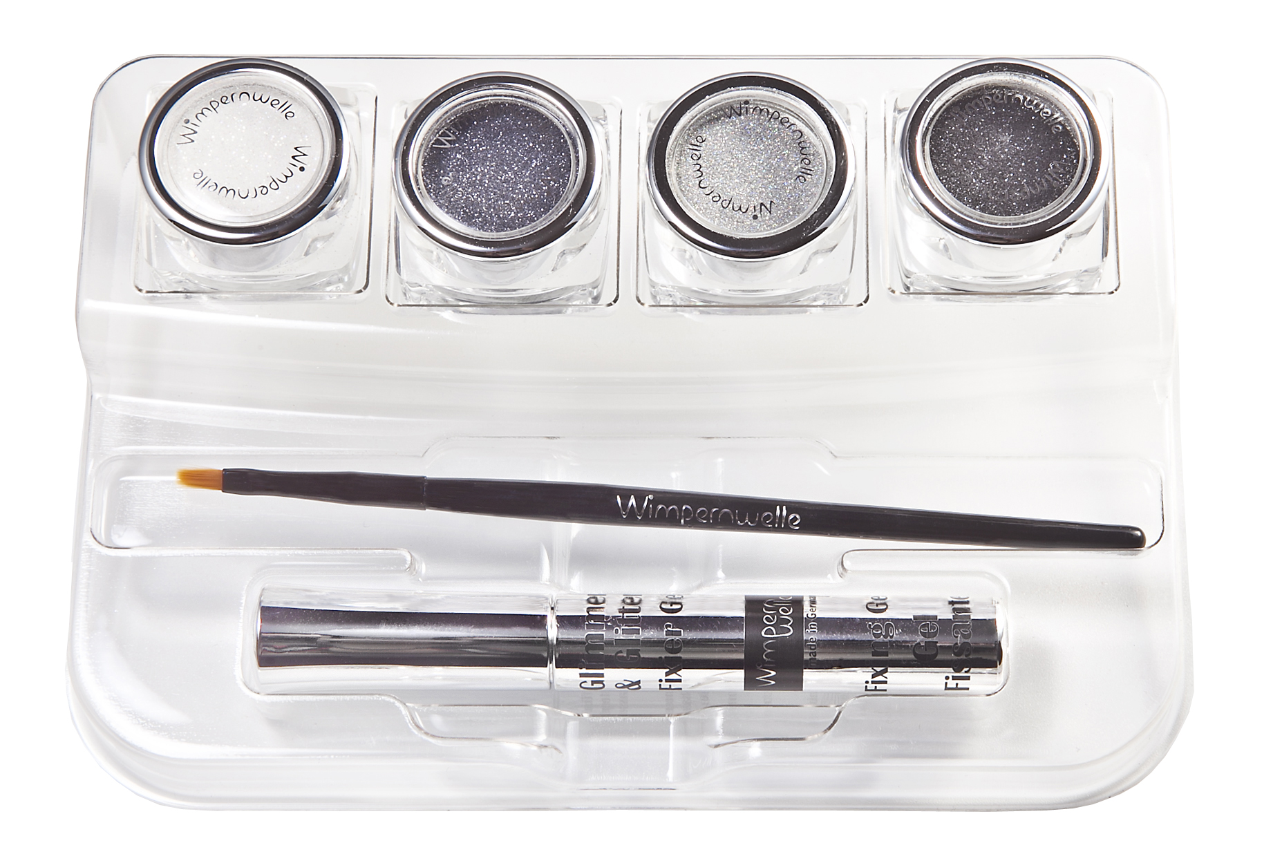 a Fixing Gel and a Brush for the application of the Glimmer & Glitter Eyeshadow.