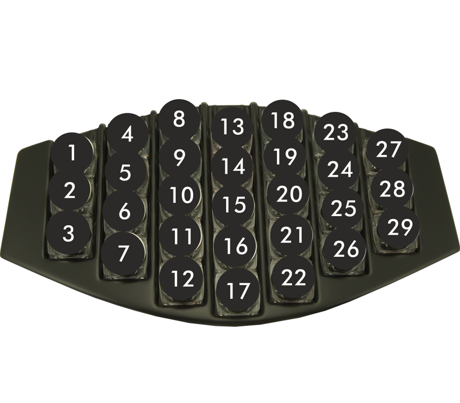29 GLIMMER & GLITTER assortment of 7 Eyeshadow colours: 5 x Snow white, 5 x Platinum, 5 x Nut-brown, 4 x Sand, 4 x Rose, 3 x Black, 3 x Silver