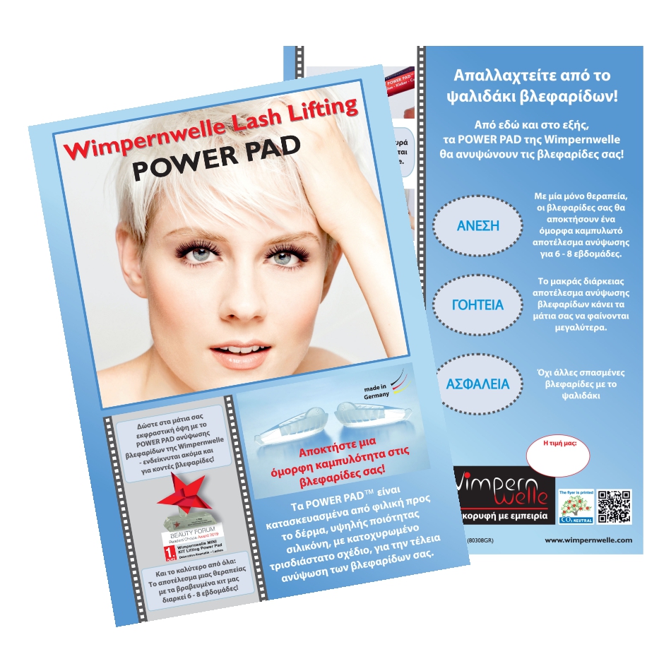 1 Wimpernwelle Lifting POWER PAD™ Kit, 1 TRIO-TOOL, 1 Sodium Chloride Solution 0,9%, 1 Glue & Roll Remover, 1 BINACIL™ Lash Tint black, 1 BINACIL™ Hydrogen Peroxide Creme, 1 BINACIL™ Mixing Pad small, 20 pairs of self-adhesive Skin Protection Pads, 1 Lamination Fluid professional, 1 Poster DIN A2, 20 Customer flyers “Wimpernwelle Lash Lifting POWER PAD”