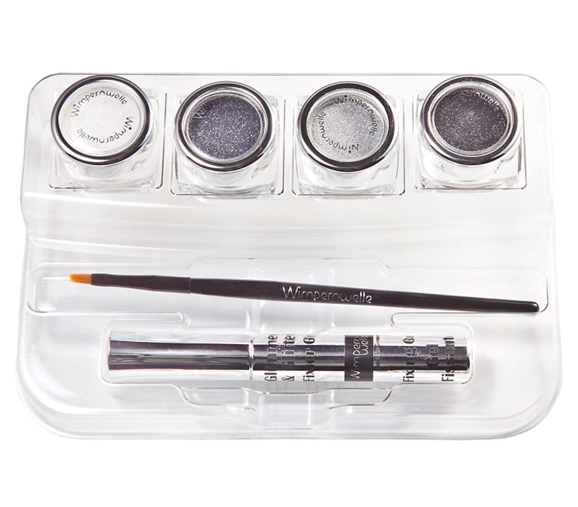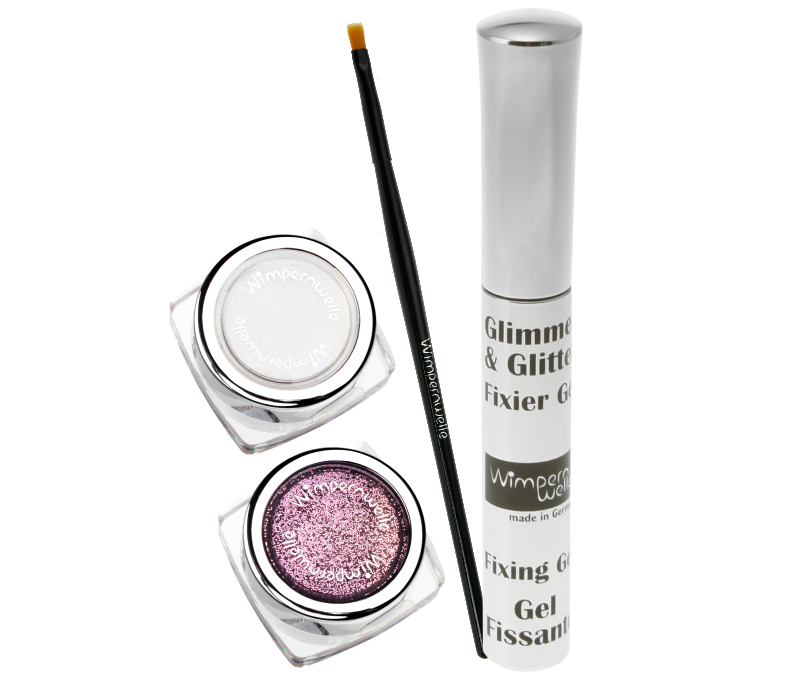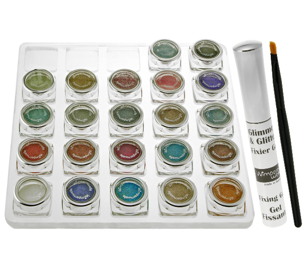 1 x Fixing gel, 1 x Brush and 4 colours of your choice on the Glimmer & GlitterBAR
