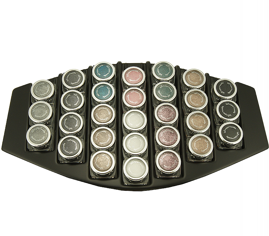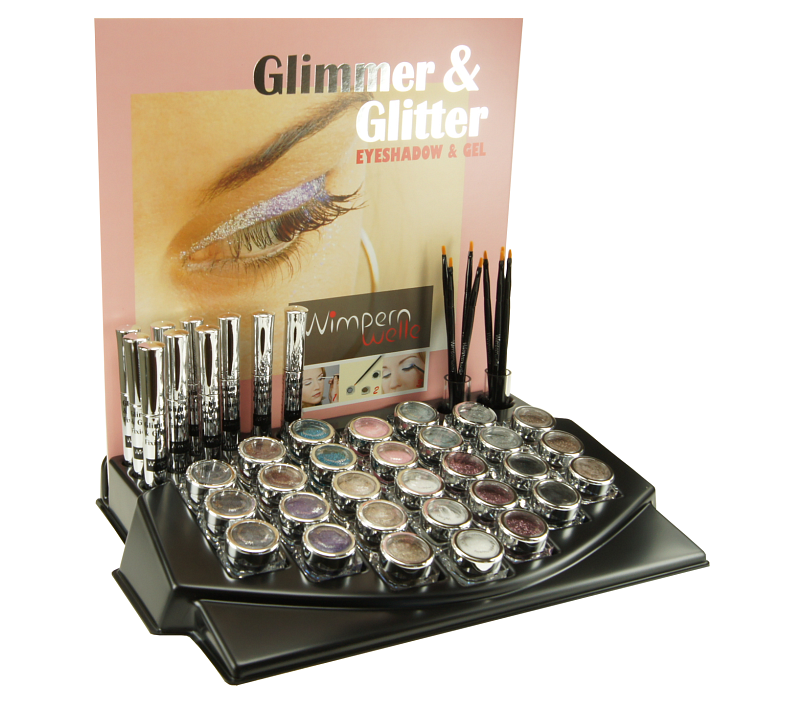 29 GLIMMER & GLITTER assortment of 10 Eyeshadow colours: 4 x Platinum, 4 x Nut-brown, 3 x Snow white, 3 x Sand, 3 x Rose, 3 x Black, 3 x Silver, 2 x Dark green, 2 x Coral, 2 x Turquoise