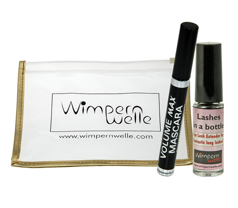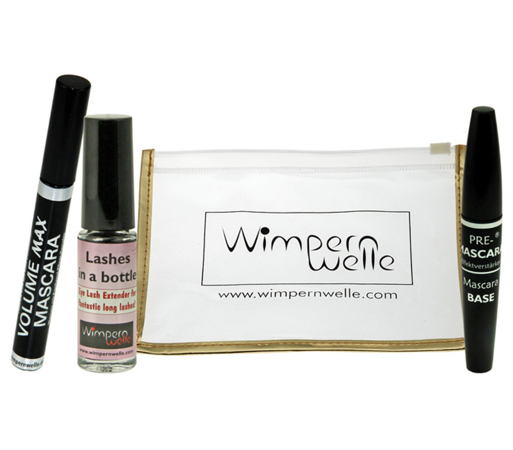 1 x PRE-Mascara, 1 x VOLUME MAX Mascara and 1 x Lashes in a bottle in a cosmetic bag