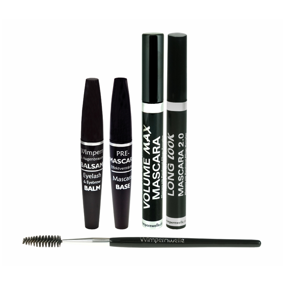 1 x Wimpern- und Augenbrauen BALSAM, 1 x PRE-Mascara, 1 x VOLUME MAX Mascara, 1 x LONG LOOK Mascara 2.0 und 1 x Wimpernbürstchen in einem Kosmetikbeutel