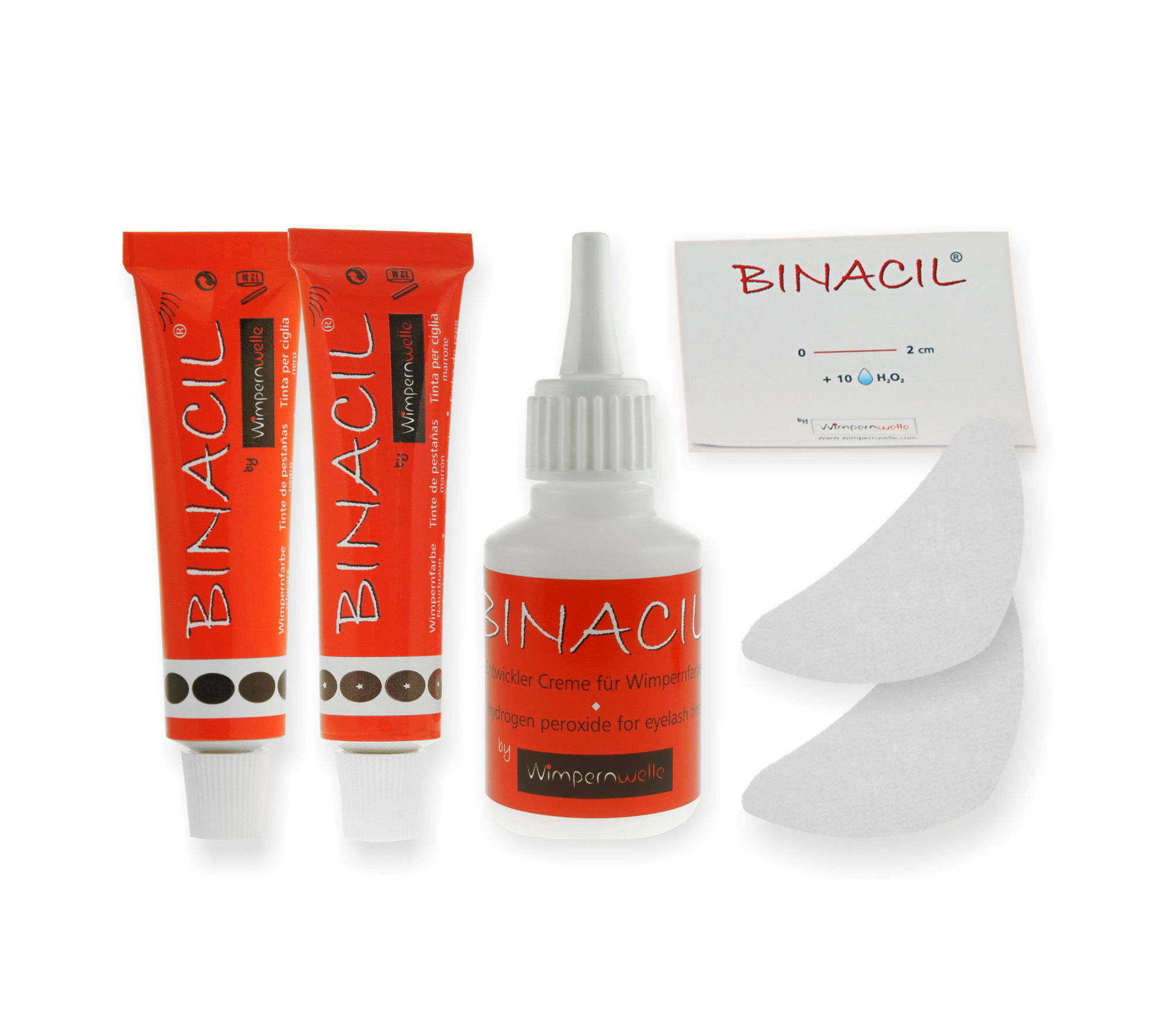 2 tubki po 15 g farby BINACIL® do rzęs i brwi (czarny i naturalny brąz z aplikatorem do mieszania i nanoszenia BINACIL®), 20 ml kremowego utleniacza BINACIL®, 24 płatki osłaniające skórę BINACIL®, 1 bloczek do mieszania BINACIL® (10 sztuk)