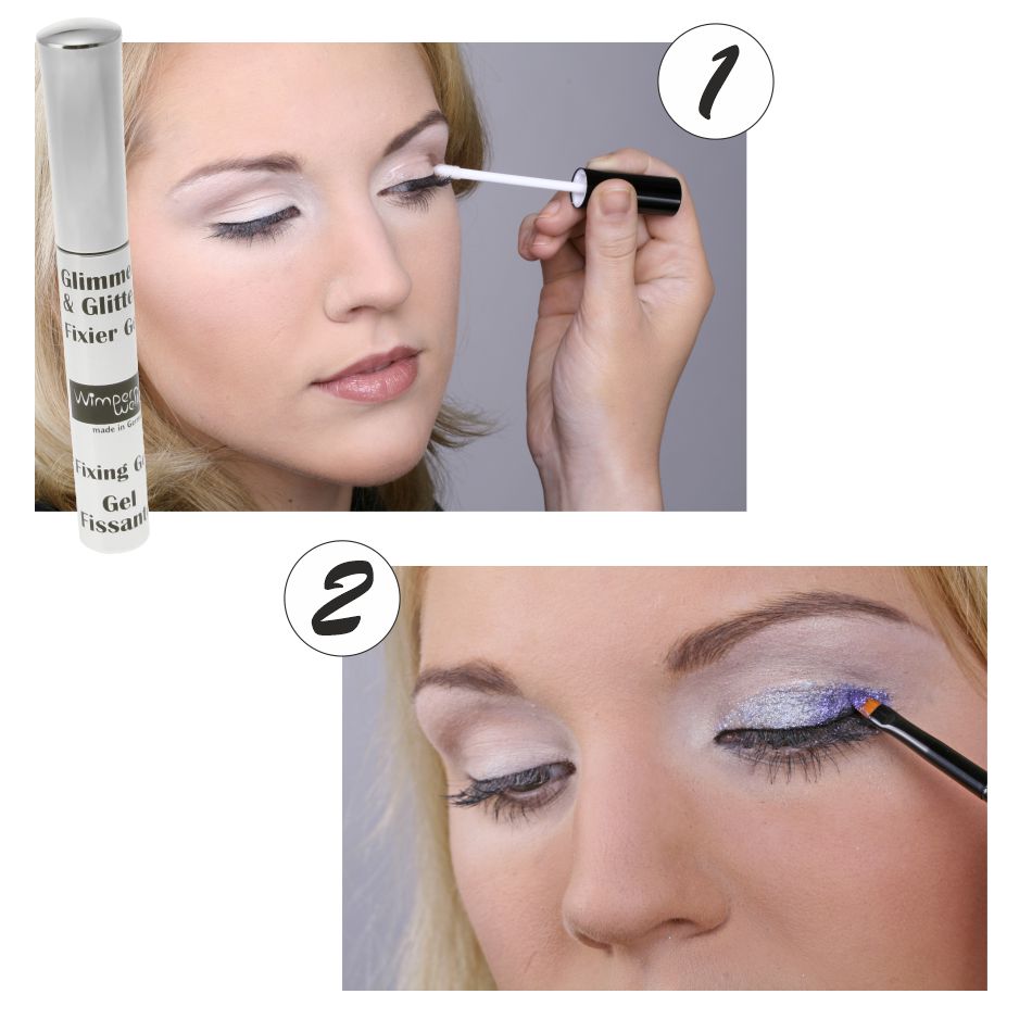 Paso 1: Aplique el Gel fijador Glimmer & Glitter como base adherente: tanto puede ser aplicado ampliadamente, sólo como un delineador de ojos o también sobre un maquillaje ya existente.