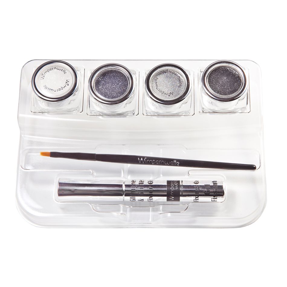 Glimmer & GlitterBAR con 4 tonalidades Sombra de ojos (blanco, plata, platino, negro), Gel fijador y Pincel