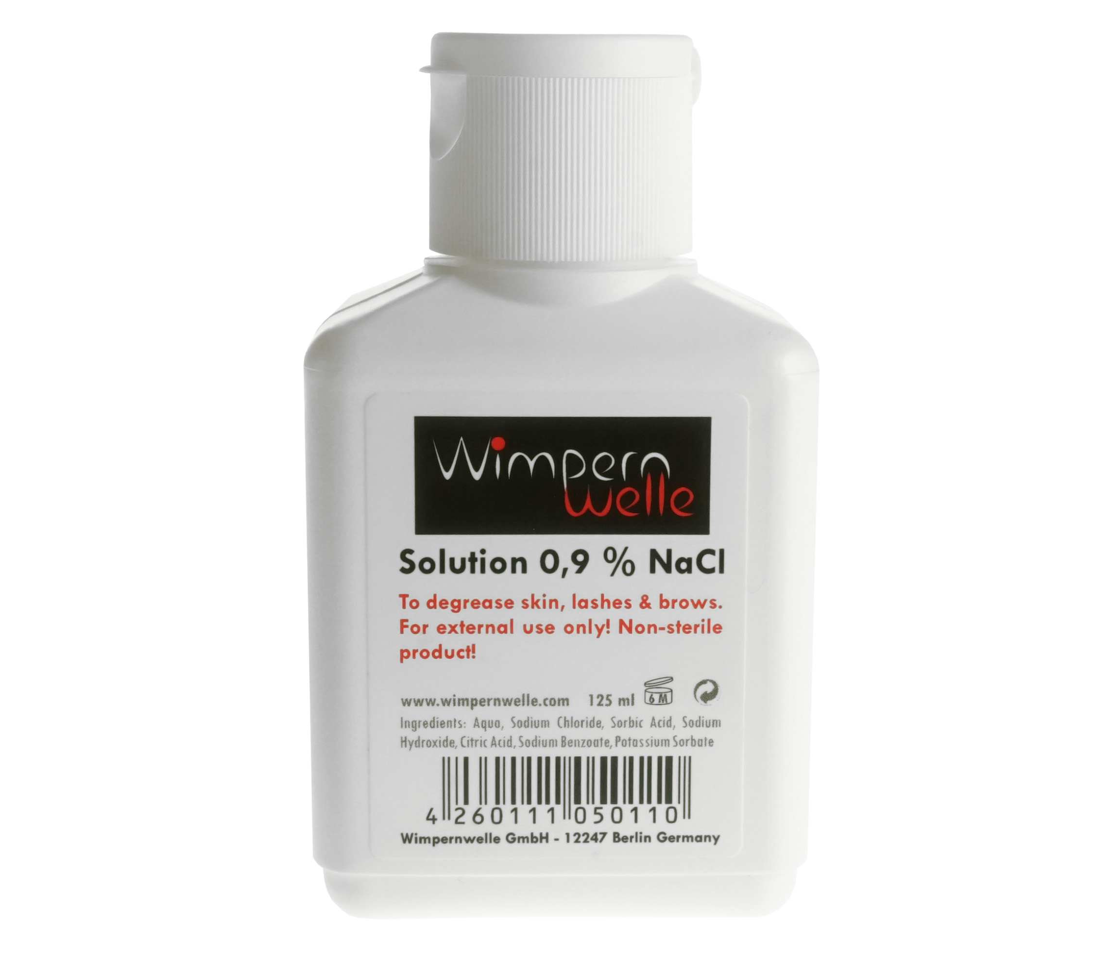 Roztwór soli fizjologicznej (Artykuł nr 10330) - stosuje się "obowiązkowo" przed każdym zabiegiem, aby odtłuścić powieki i rzęsy.