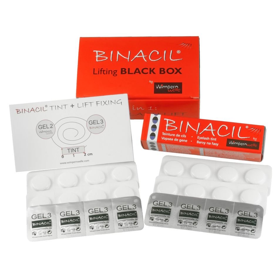 1 Basis Set Lifting CLASSIQUE Monodose, 1 Sérum physiologique, 1 Dissolvant colle & bigoudi, 1 BINACIL® Teinture des cils noir, 1 BINACIL® Eau oxygénéé, 1 BINACIL® bloc pour mélange-coloration petit, 25 feuilles de protection pour la peau, 1 Fluide de lamination professionnel, 1 Poster DIN A2, Brochures pour clients "Wimpernwelle Lifting des cils CLASSIQUE"