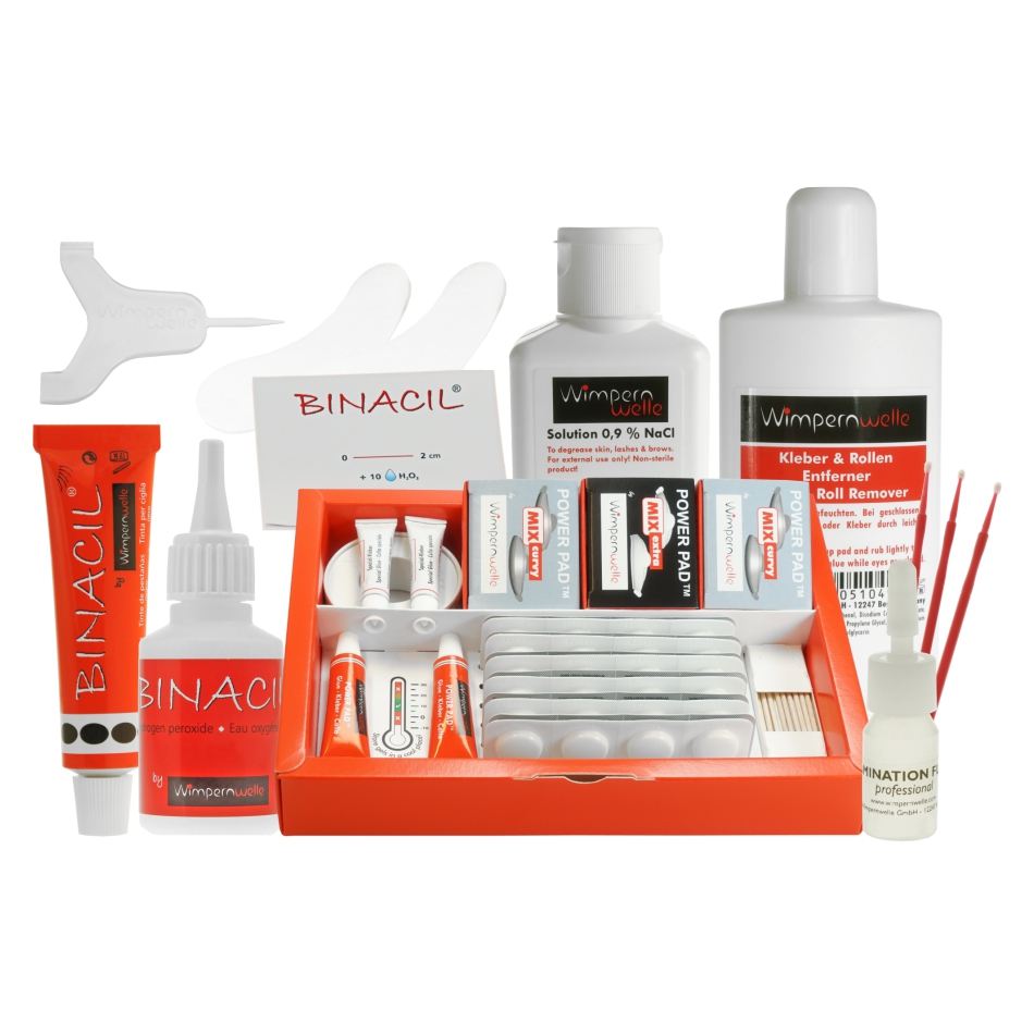 1 Kit Wimpernwelle Lifting POWER PAD, 1 Sérum physiologique, 1 Dissolvant colle & bigoudi, 1 TRIO-TOOL, 1 BINACIL® Teinture des cils noir, 1 BINACIL® Eau oxygénéé, 1 BINACIL® bloc pour mélange-coloration petit, 20 paires feuilles de protection auto-adhésifs pour la peau, 1 Fluide de lamination professionnel, 1 Poster DIN A2, Brochures pour clients "Wimpernwelle Lifting des cils POWER PAD"