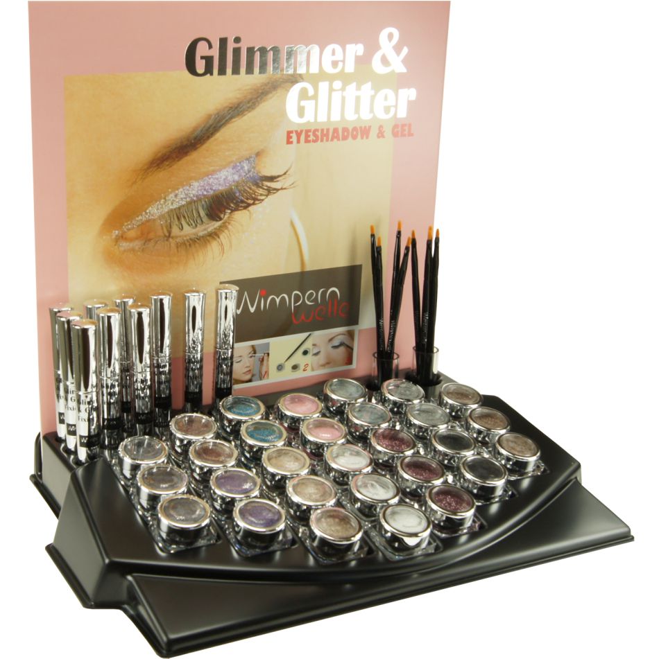 29 x GLIMMER & GLITTER Fards à paupières, 10 x Pincau, 10 x Gel fixateur, Brochures aux clients, 1 x Poster et testeurs: 1 x Gel fixateur, 1 x Pinceau, 4 x Fards à paupières (Blanc neige, Gris platine, Brun et Rosé) sur le Glimmer & GlitterBAR