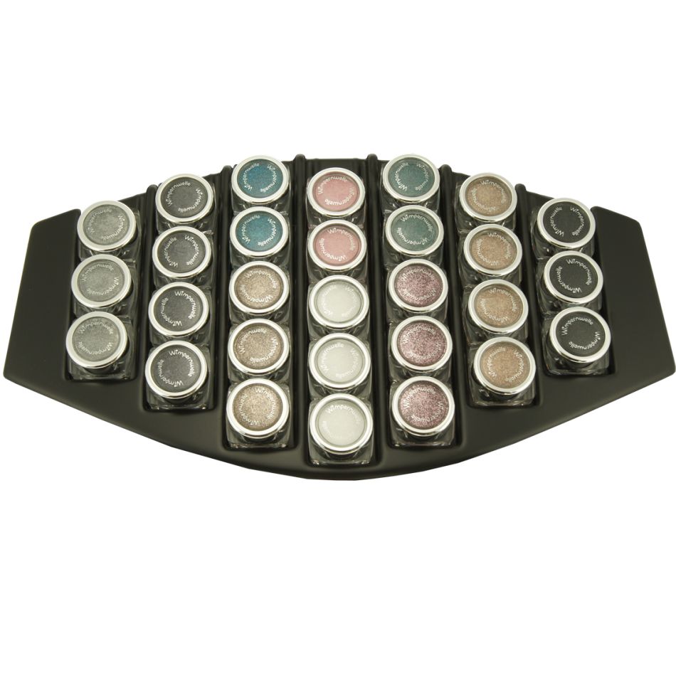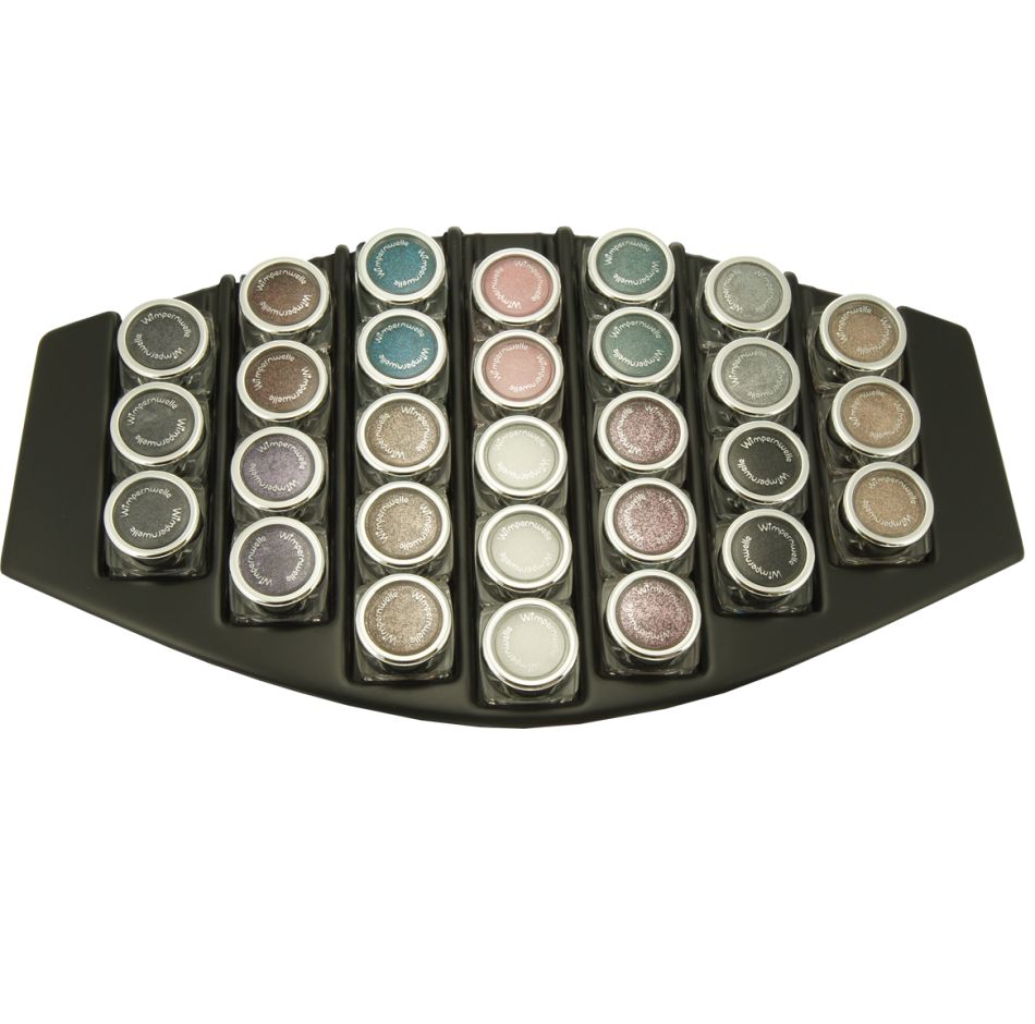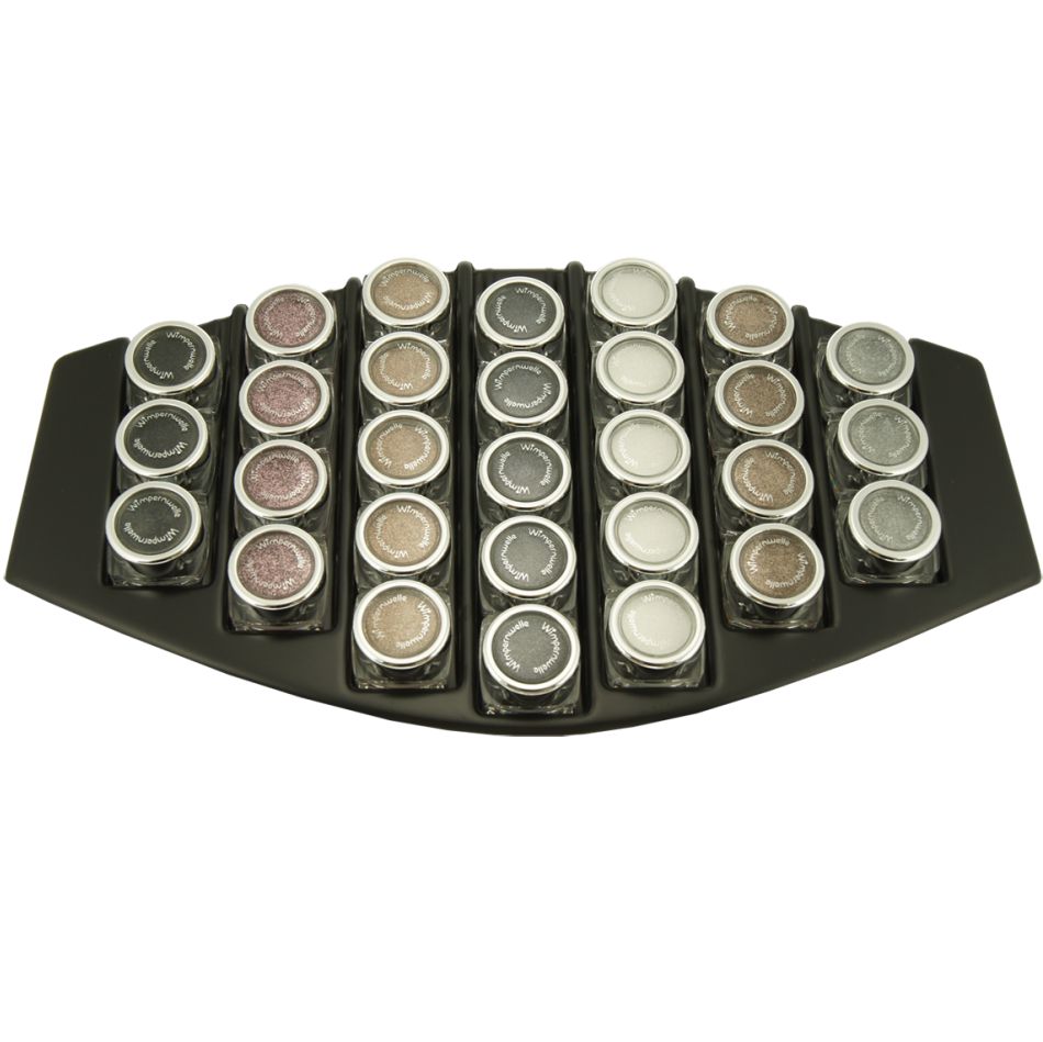 29 x GLIMMER & GLITTER Fards à paupières en 7 couleurs: 5 x Blanc neige, 5 x Gris platine, 5 x Brun, 4 x Sable, 4 x Rosé, 3 x Noir, 3 x Argent